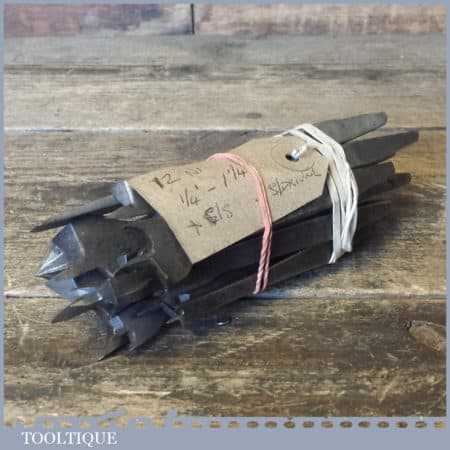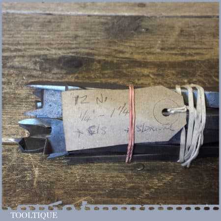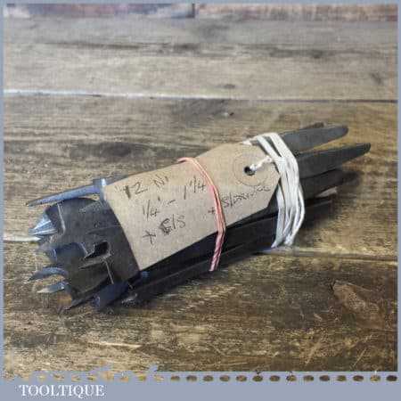 12 No: cast steel centre bits ranging between 1/4” and 1 ¼” plus screwdriver and countersink bits, in good used condition.