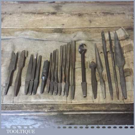 Canvass bit roll containing an assortment of 19 No: vintage cast steel bits including spoon, taper, rimer, screwdriver and countersink bits by various makers, in good used condition.