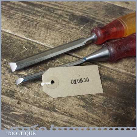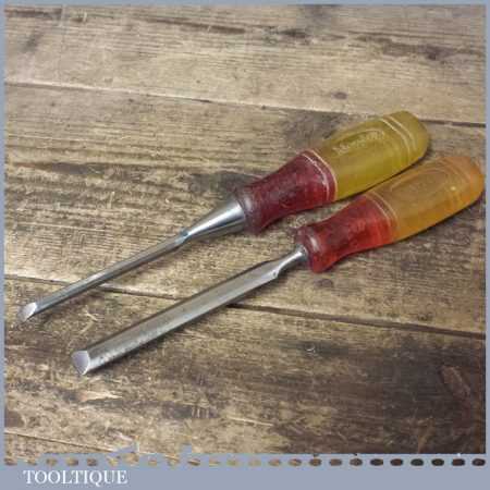 2 No Marples Shamrock carpenter’s bevel edge chisels (¼” & ½”) with shatterproof handles, in good used condition fully refurbished sharpened and honed ready for use.