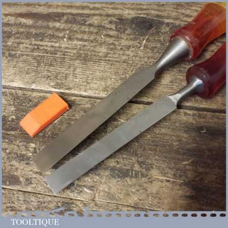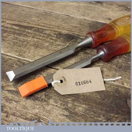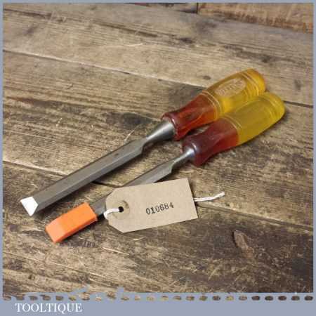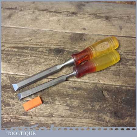 2 No: Marples Shamrock carpenter’s bevel edge chisels (½” & 5/8”) with shatterproof handles, in good used condition fully refurbished sharpened and honed ready for use.