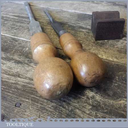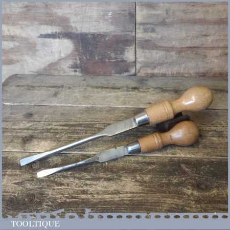 2 No: vintage cabinet makers beechwood handled screwdrivers measuring 11” & 14” long, one stamped 1967 GPO, fully refurbished ready for use.