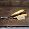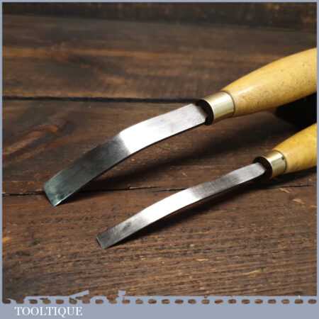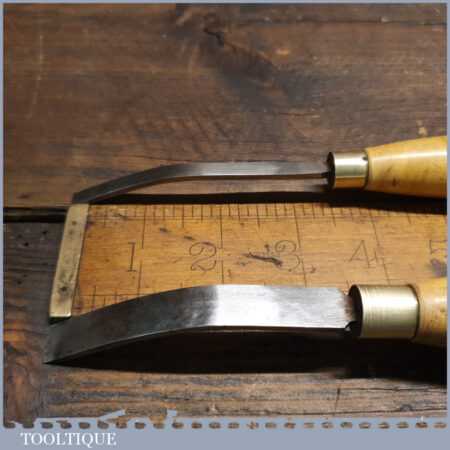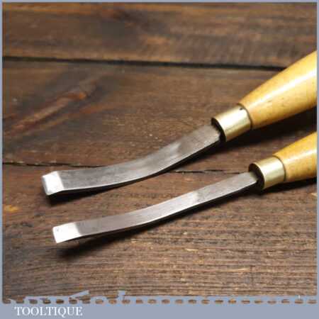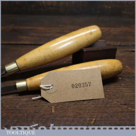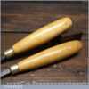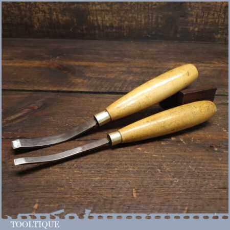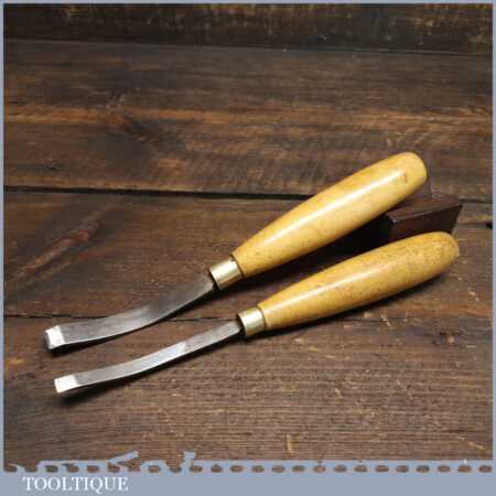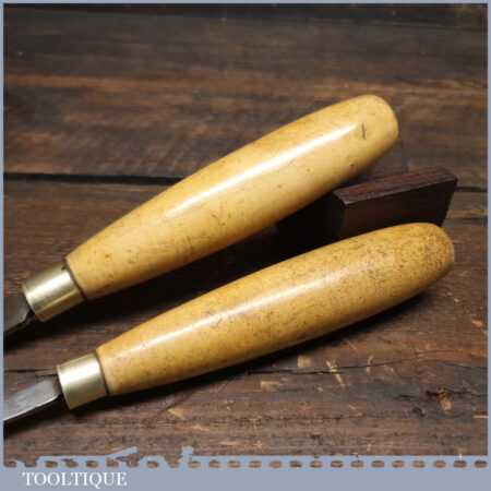 2 No: vintage Pattern makers ¼” + ½” curved flat woodcarving chisels with boxwood handles in good used condition, fully refurbished sharpened and honed ready for use