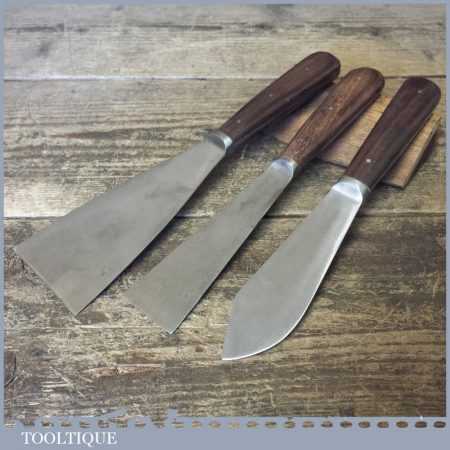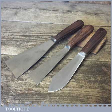 2 No: good quality vintage rosewood handled scrapers (2 ½” & 3”) and 1 No: rosewood handled putty knife in good used condition. 1 scraper is named Tyzack