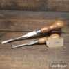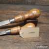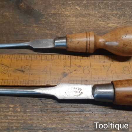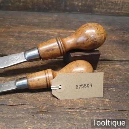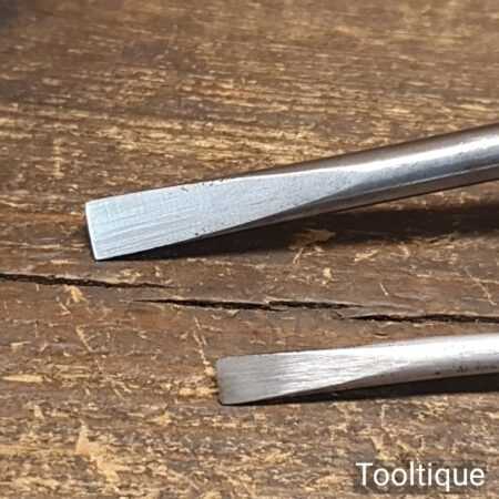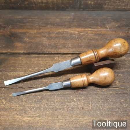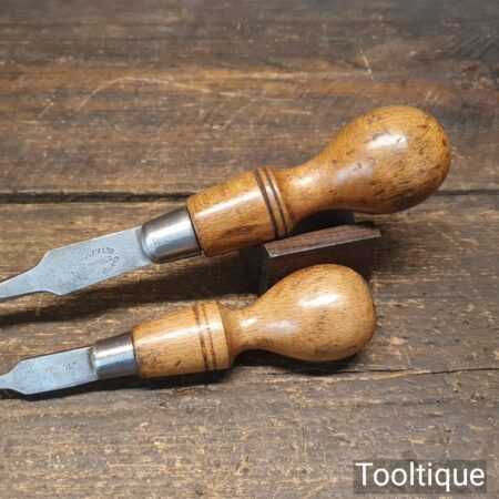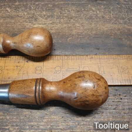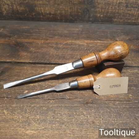 2 No: Vintage turnscrew screwdrivers with ⅜” + ¼” wide ends and beechwood handles. The screwdrivers have redressed heads using water cooled process and are in good used condition.