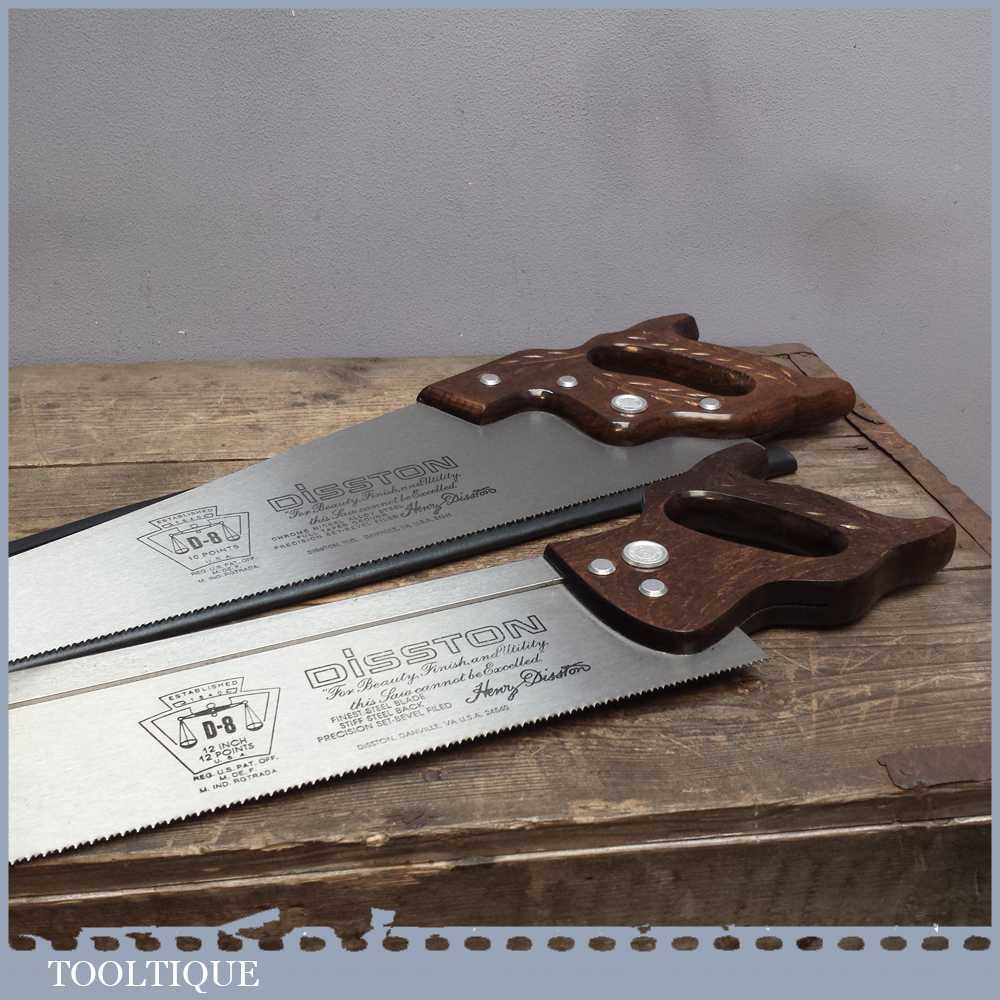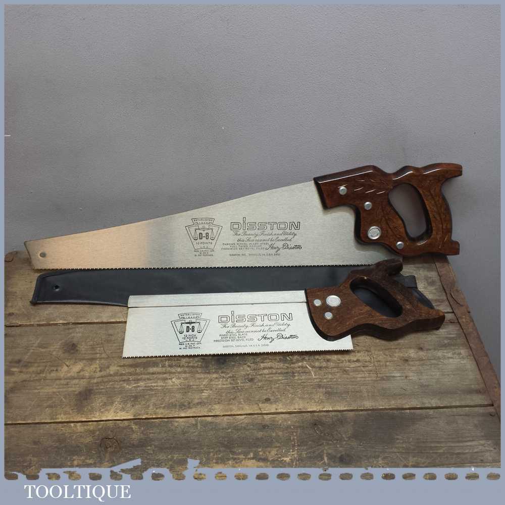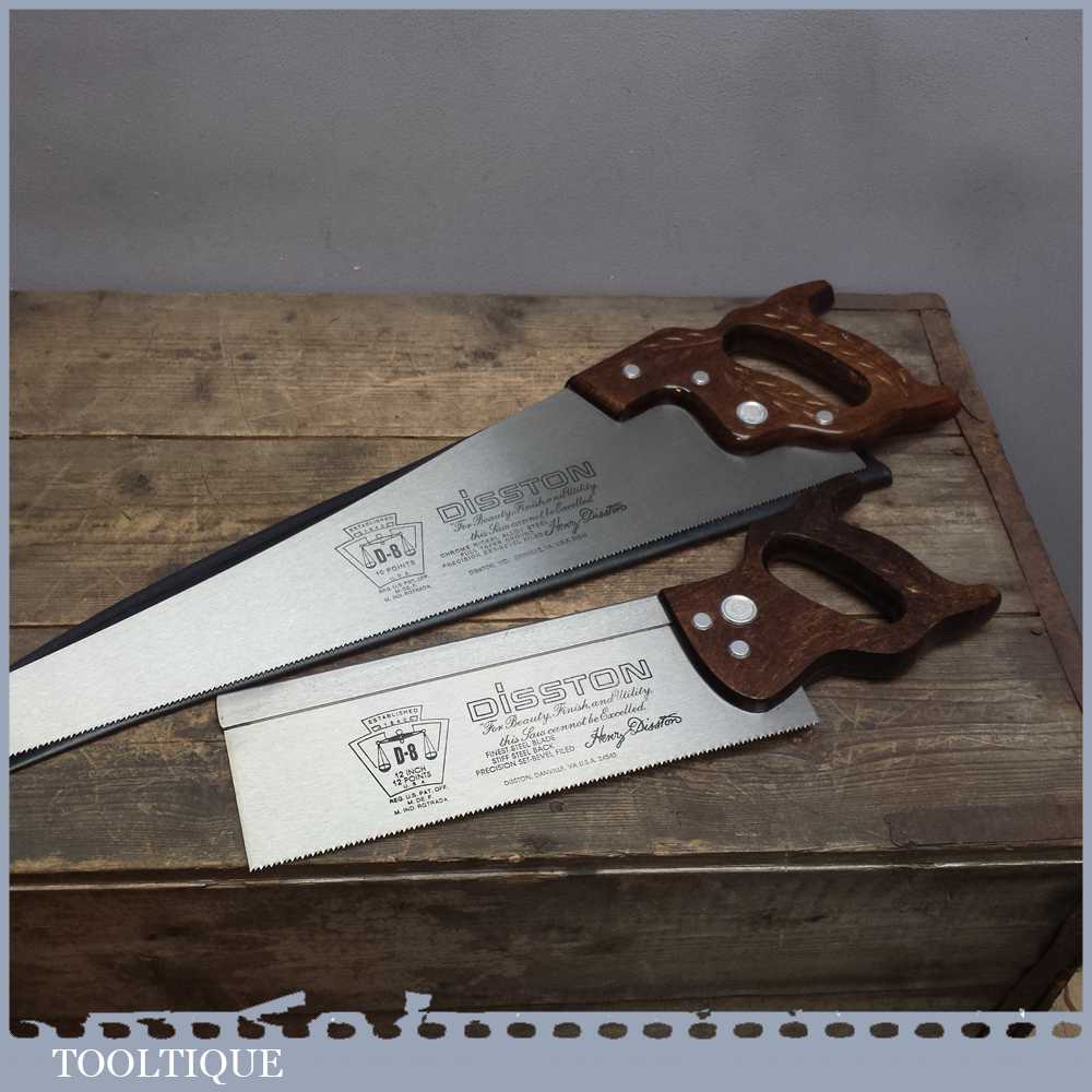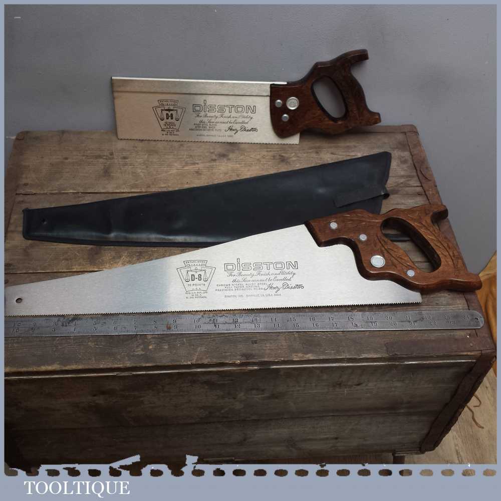 Disston D8 USA 12” steel back saw with 12 tpi and a 22” panel saw with 10 tpi in very good lightly used condition. Both saws are sharp and straight and have seen very little use.