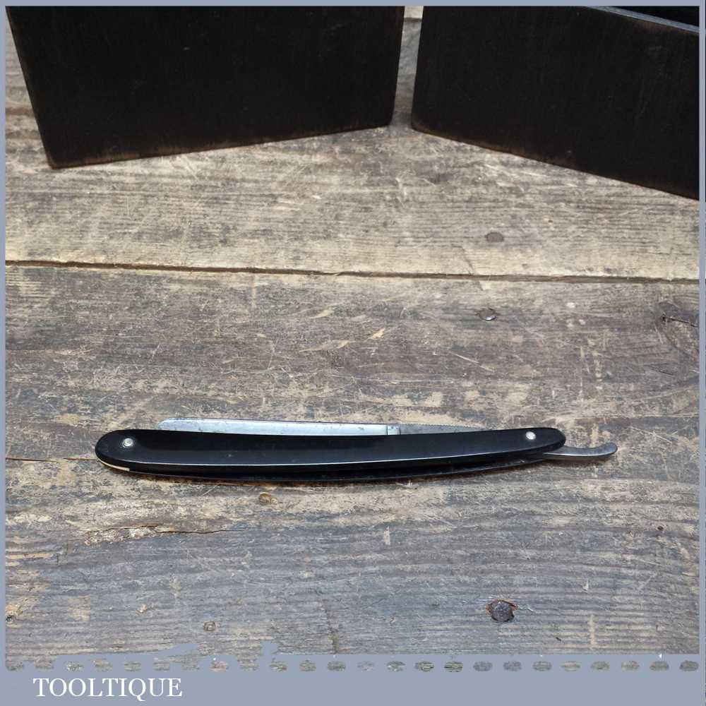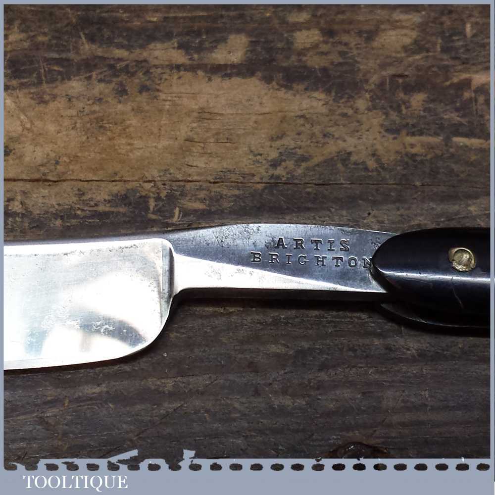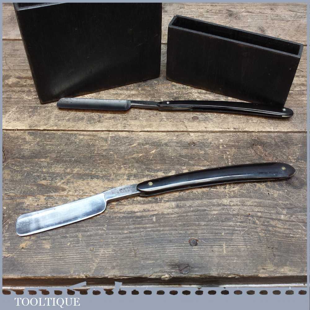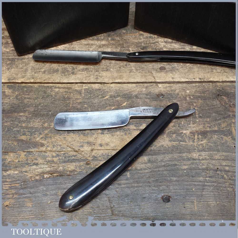 Vintage cut throat Straight razor by Artis Brighton and one by Stesen’s in a wooden case and lid that holds up to four razors.