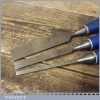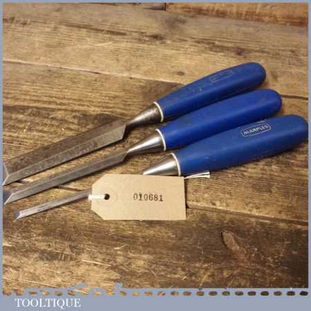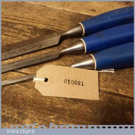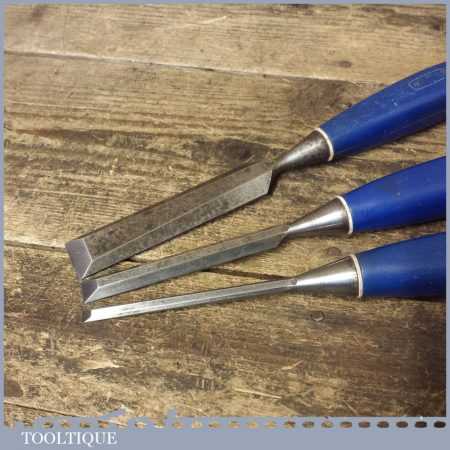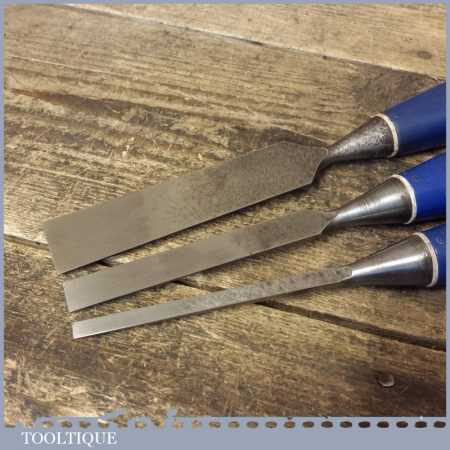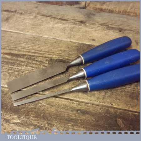 3 No: Marples carpenter’s bevel edge chisels (5/32”, 1/ 2” & 1”) with plastic handles, in good used condition fully refurbished sharpened and honed ready for use