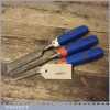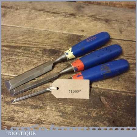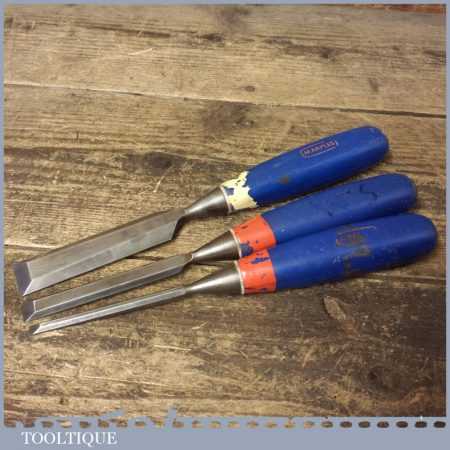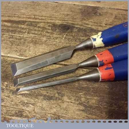 3 No: Marples carpenter’s bevel edge chisels (1/4”, 1/2” & 1”) with plastic handles, in good used condition fully refurbished sharpened and honed ready for use.