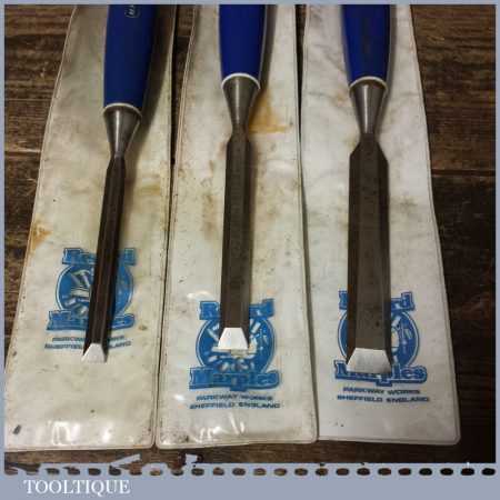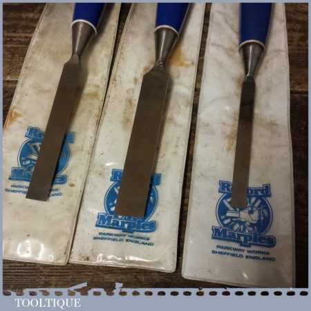 3 No: Record Marples carpenter’s bevel edge chisels (3/8”, 1/ 2” & 3/4”) with plastic handles, in good used condition fully refurbished sharpened and honed ready for use.