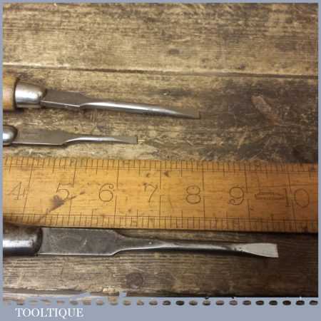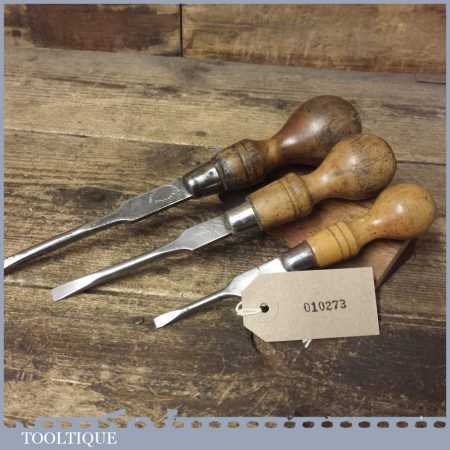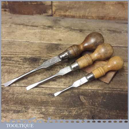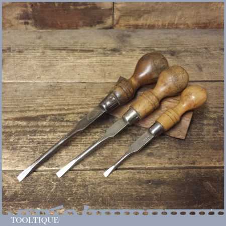 3 No: vintage cabinet makers beechwood handled screwdrivers, fully refurbished ready for use. These have been water cooled during the reshaping process to ensure they retain their original tempering and will work as they would have originally.