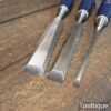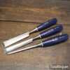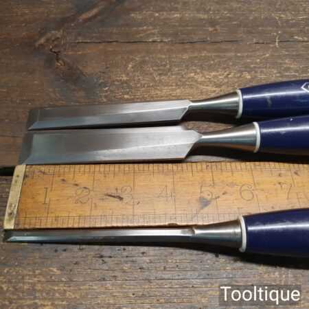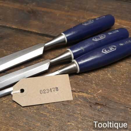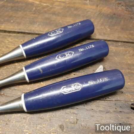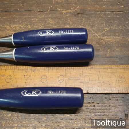 3 No: vintage C.K No 1178 carpenter’s bevel edge chisels (1/4”, 3/4” & 1”) with plastic handles in good used condition, fully refurbished sharpened and honed ready for use.