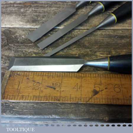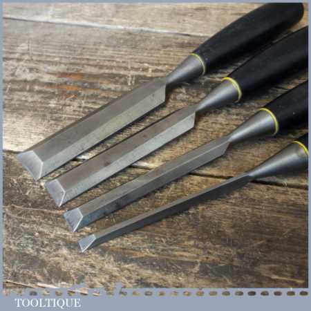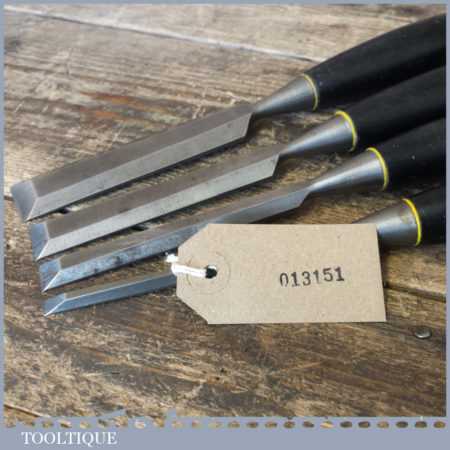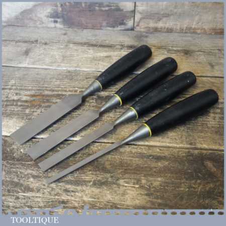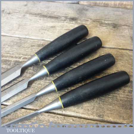 4 No: Stanley carpenter’s bevel edge chisels (1/4”, 1/ 2”, 3/4” & 1”) with black plastic handles in good used condition, fully refurbished sharpened and honed ready for use.