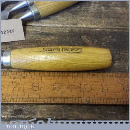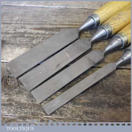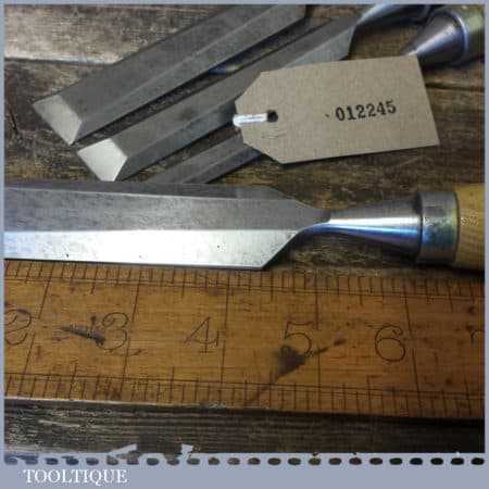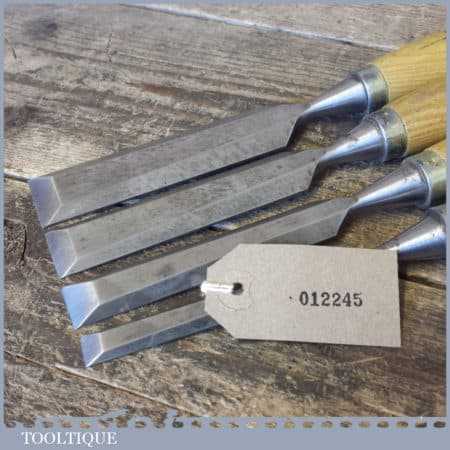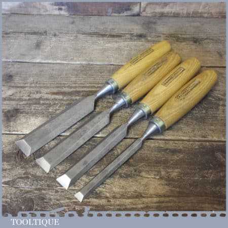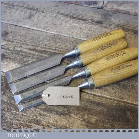 4 No. vintage Marples Ridgeway carpenter’s bevel edge chisels (1/ 2”, 3/4”, 1” and 1 ¼”) with ash handles in good used condition, fully refurbished sharpened and honed ready for use. All refurbished chisels are water cooled during the sharpening process to ensure the tempering is not affected.