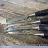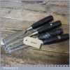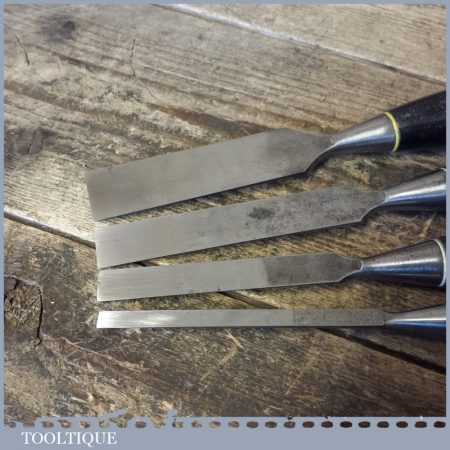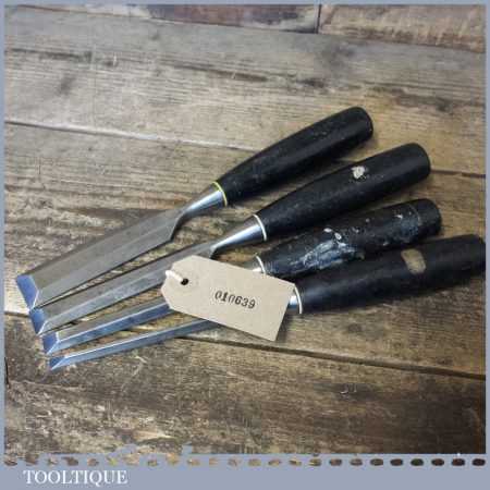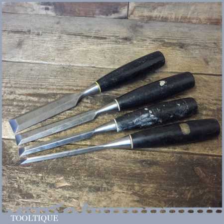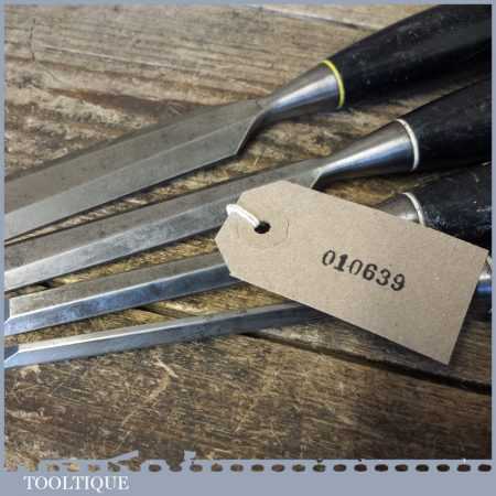 4 No: vintage Stanley No: 5001 socketed bevel edge chisels (from ¼” to 1”) with plastic handles in good used condition, fully refurbished sharpened and honed ready for use.
