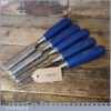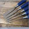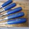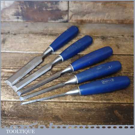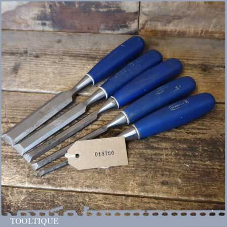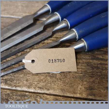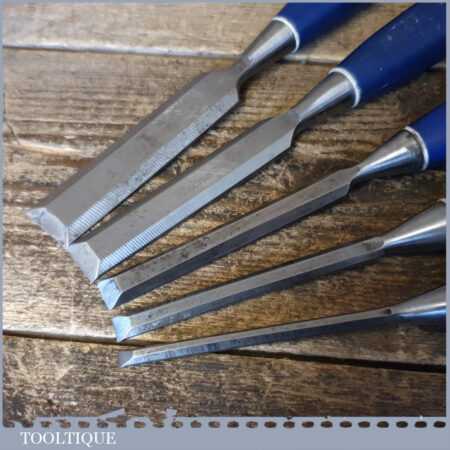 5 No: Marples Blue Chip carpenter’s bevel edge chisels (1/4”, 3/8”, 1/ 2”, 3/4” & 1”) with plastic handles in good used condition, fully refurbished sharpened and honed ready for use.