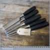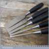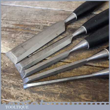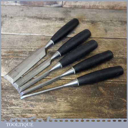 5 No: Stanley No: 5001 bevel edge chisels (1/4” to 1 ¼”) with black plastic handles in good used condition, fully refurbished sharpened and honed ready for use.