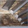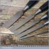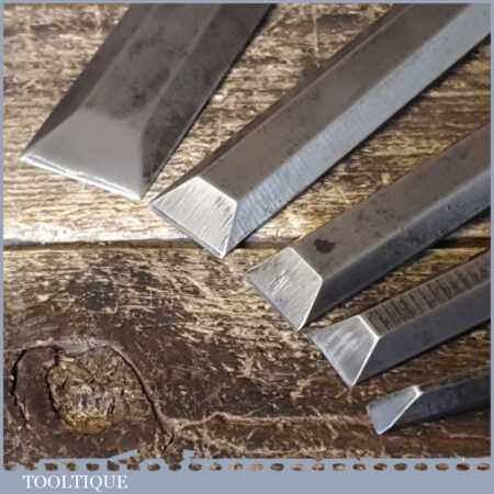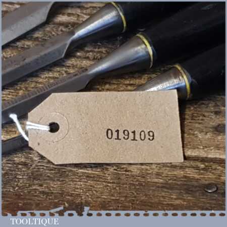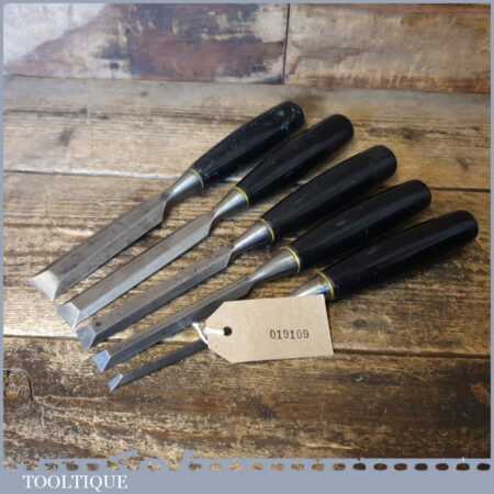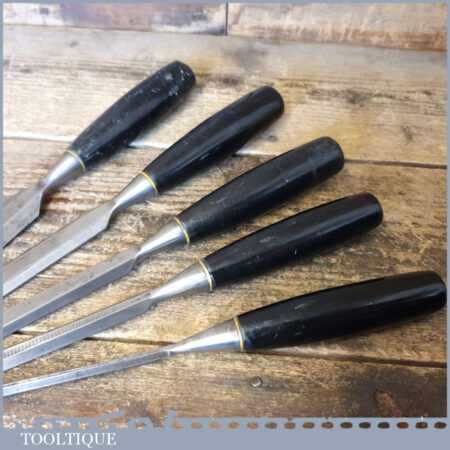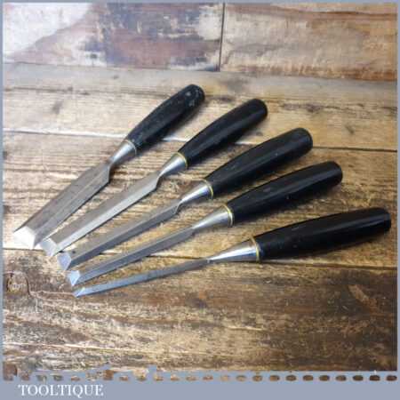 5 No: Stanley No: 5001 carpenter’s bevel edge chisels (1/4”, 3/8”, 1/ 2”, 3/4” & 1”) with plastic handles in good used condition, fully refurbished sharpened and honed ready for use. These are the earlier type with the yellow banding.