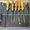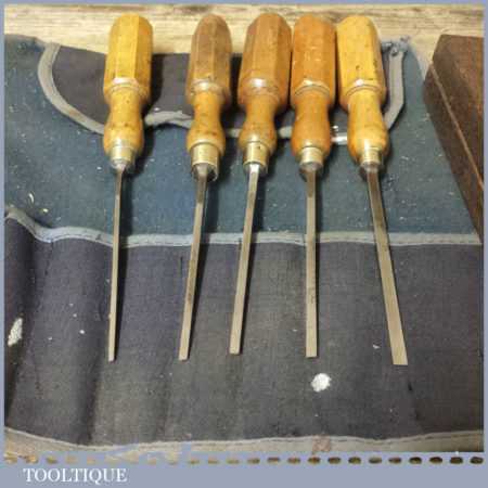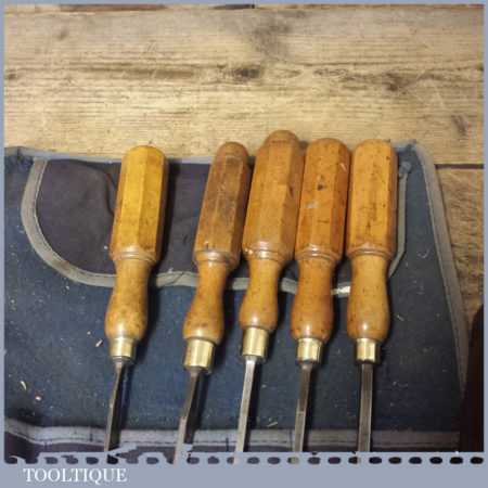 5 No. vintage carpenter’s firmer chisels by various makers with London pattern boxwood handles in good used condition, fully refurbished sharpened and honed ready for use. These are all fractionally different in size which I could see as being very handy. These types of chisels are also used by woodcarvers so the size range will have added benefits.