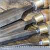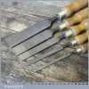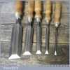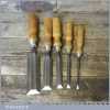 5 No: vintage Cooper & Sons, Fuluse brand carpenter’s bevel edge chisels 3/16”, 3/8”, 5/ 8”, 1” & 1 3/8” with wooden handles, in good used condition fully refurbished sharpened and honed ready for use. Made from superior forged high carbon cast steel these sets by a good manufacturer are very hard to find.