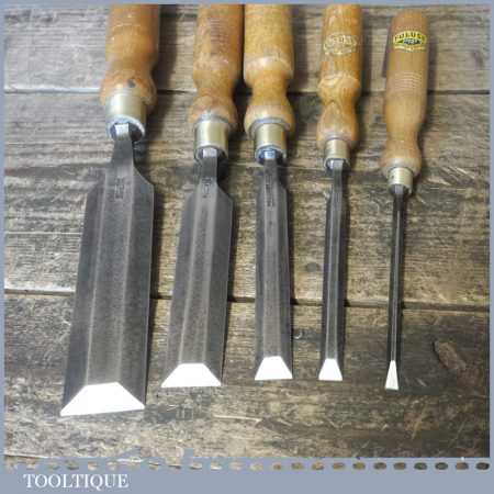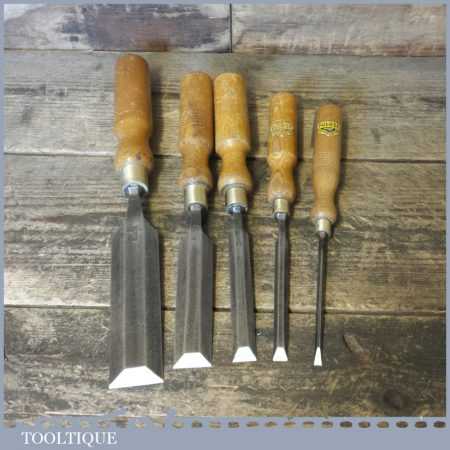 5 No: vintage Cooper & Sons, Fuluse brand carpenter’s bevel edge chisels 3/16”, 3/8”, 5/ 8”, 1” & 1 3/8” with wooden handles, in good used condition fully refurbished sharpened and honed ready for use. Made from superior forged high carbon cast steel these sets by a good manufacturer are very hard to find.