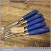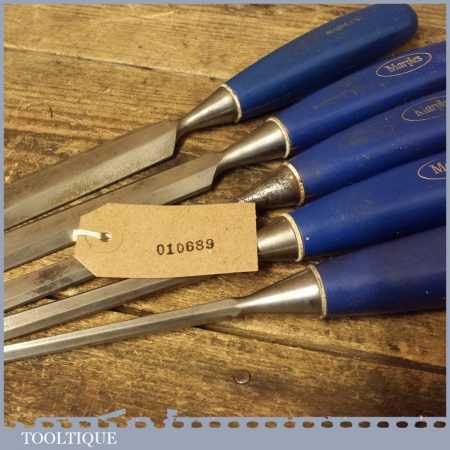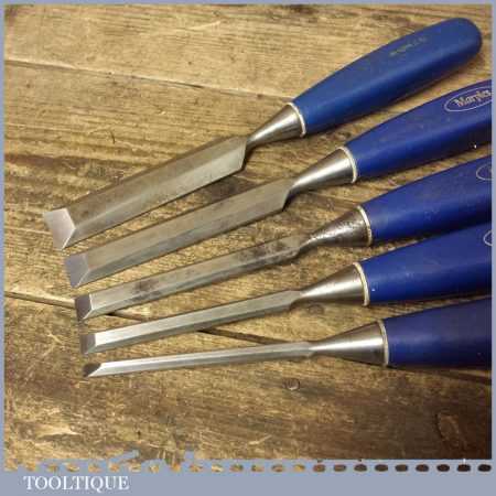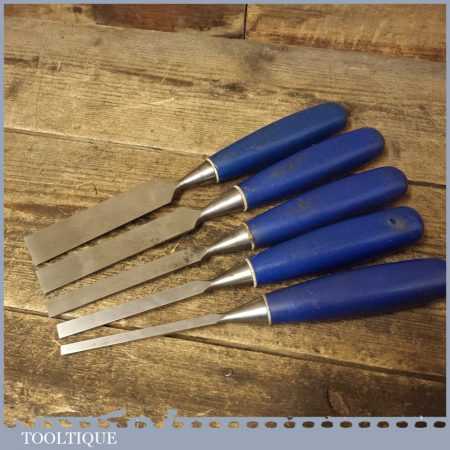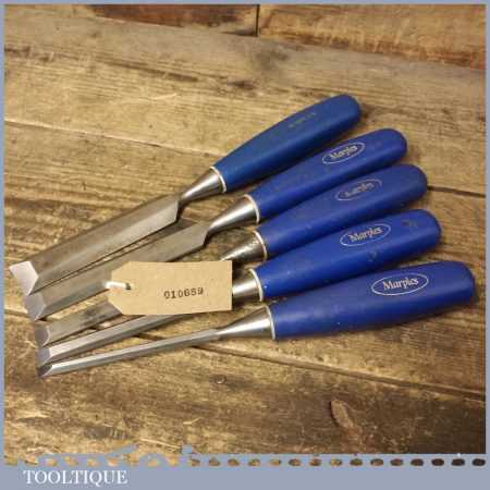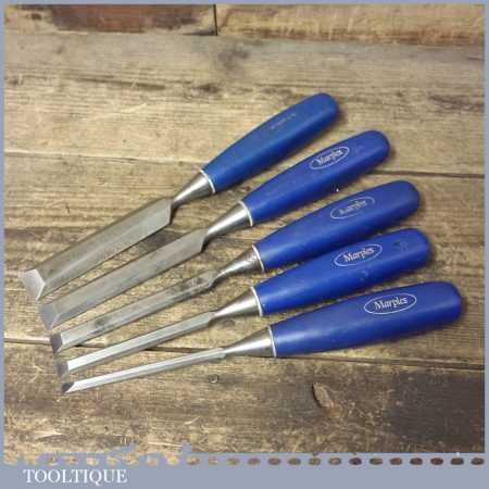 5 No: vintage Marples socketed bevel edge chisels (from ¼” to 1”) with plastic handles in good used condition, fully refurbished sharpened and honed ready for use.