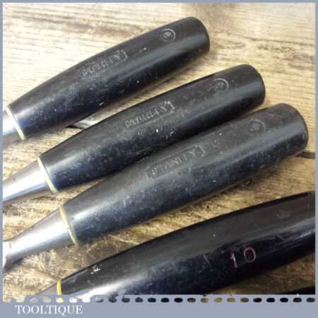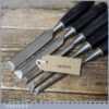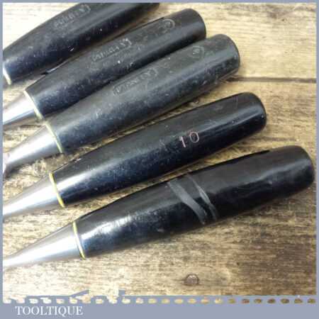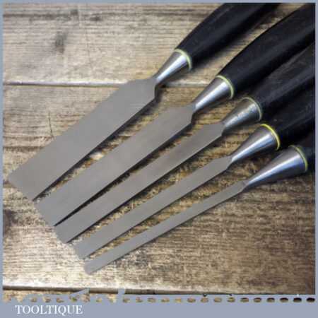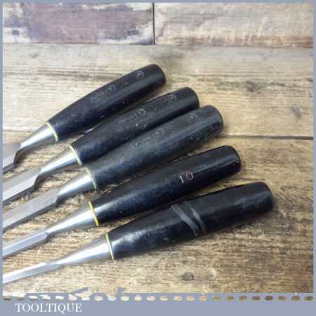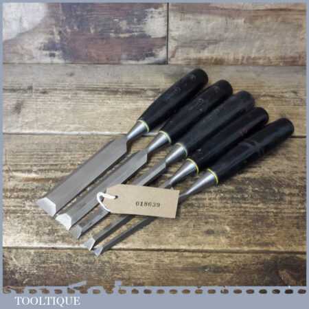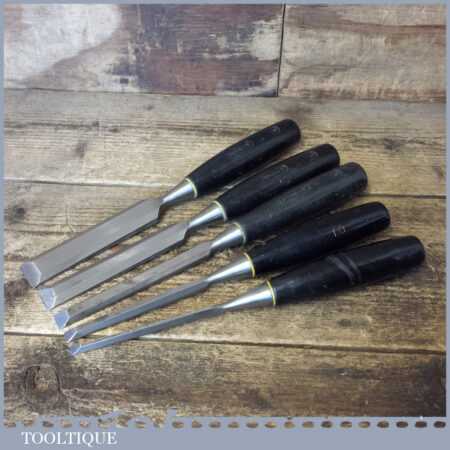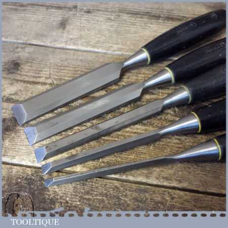 5 No: Stanley No: 5001 carpenter’s bevel edge chisels (1/4”, 3/8”, 1/ 2”, 3/4” & 1”) with plastic handles in good used condition, fully refurbished sharpened and honed ready for use. Note: this is a mixture of earlier and later types defined by the yellow and white band.