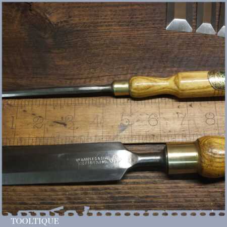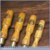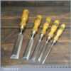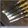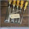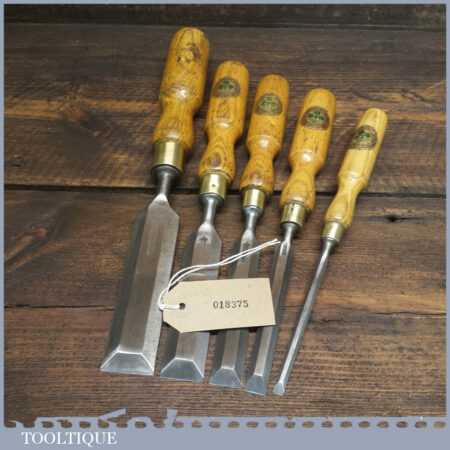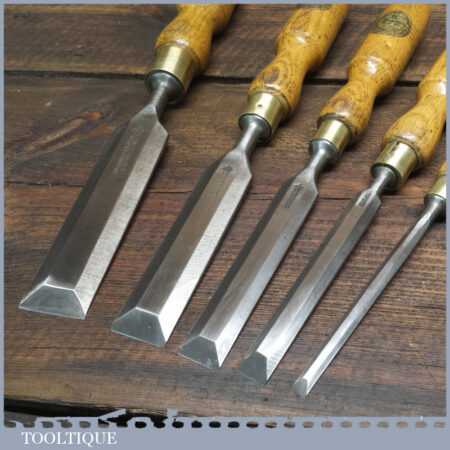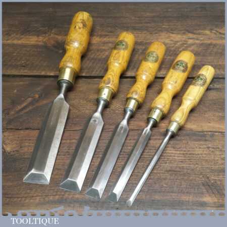 5 No: vintage Marples carpenter’s bevel edge chisels with original ash handles sizes ranging between 1/4” and 1 ¼” in good used condition, fully refurbished sharpened and honed ready for use. Very rarely do these sets come up for sale and very sought after.