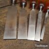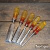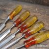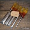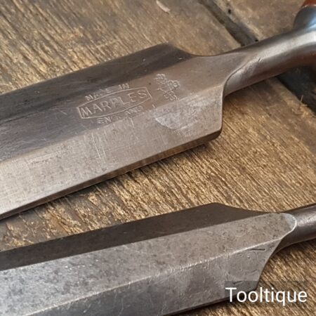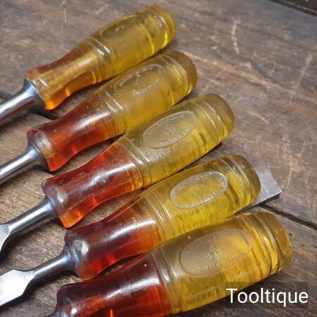 5: No: Vintage Marples Shamrock Shefield Made Marples M373 Bevel Edge Chisels with Shatterproof Handles, refurbished ready for use and in good used condition. Note: These are the early Type, Sizes 1 ¼” + 1” + ¾” + ½” + ¼”. All refurbished chisels are water cooled during the sharpening & Flattening process to ensure the tempering is not affected.
