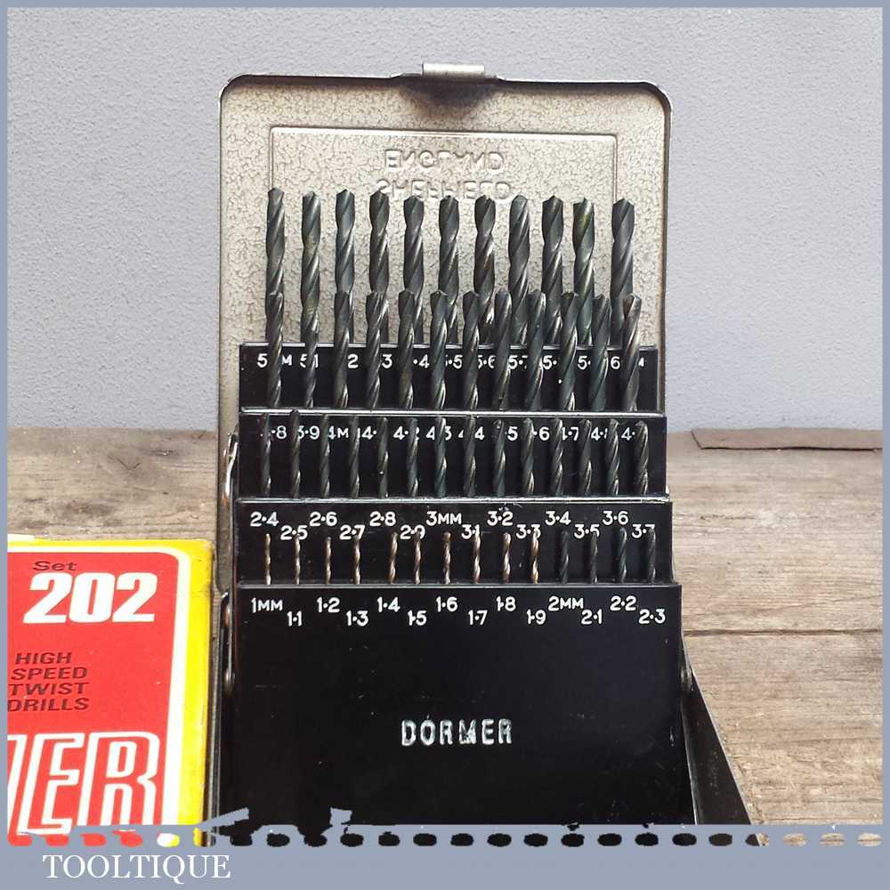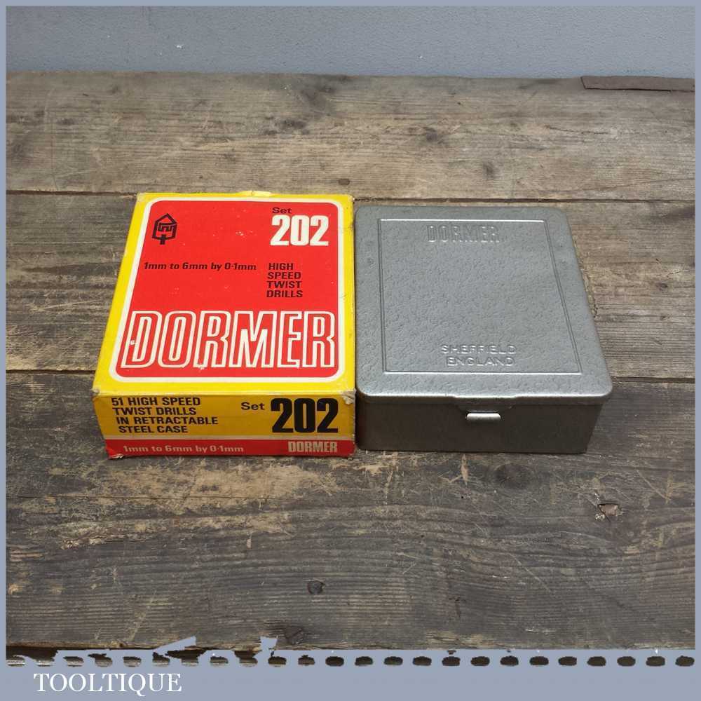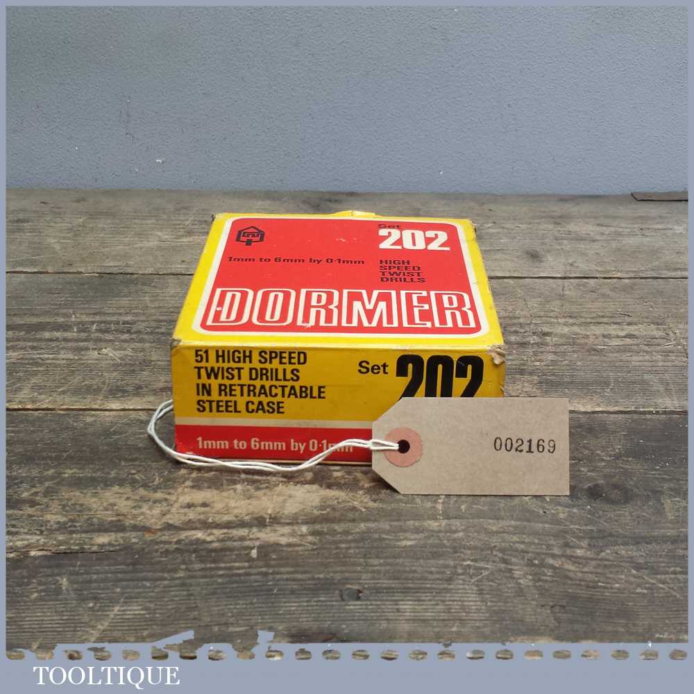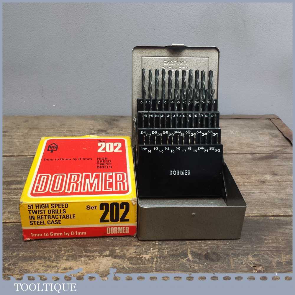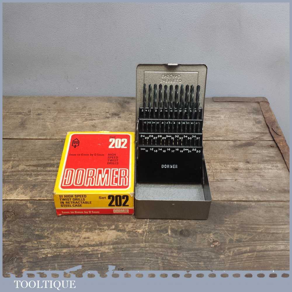 51 Dormer high speed drill bit set No: 202 in a steel case in good used condition. Note: not all the bits have been used and some have may have been re-sharpened but generally these are in good order.