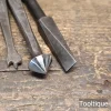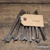 6 No: Antique Carpenters Brace Centre Bits + Countersink Bit & Screwdriver Bit, sharpened ready for use and in good used condition.