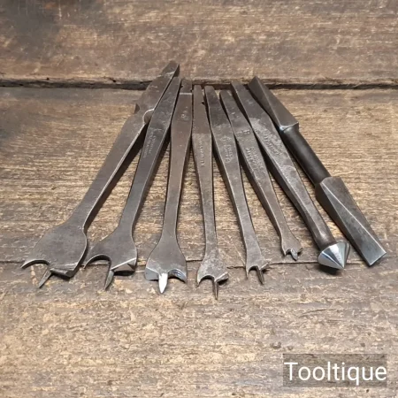 6 No: Antique Carpenters Brace Centre Bits + Countersink Bit & Screwdriver Bit, sharpened ready for use and in good used condition.