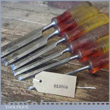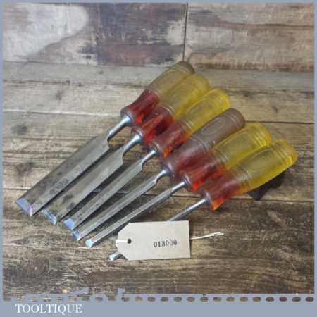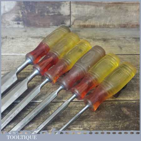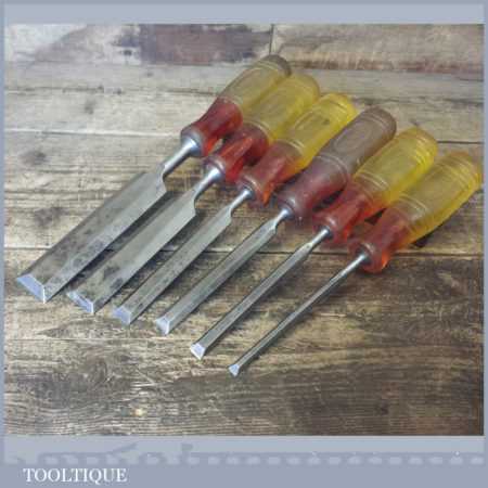 6 No: Marples Shamrock carpenter’s bevel edge chisels (1/4”, 3/8”, 1/2”, 5/8”, 1” and 1 ¼”) with shatterproof handles in good used condition, fully refurbished sharpened and honed ready for use.