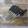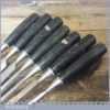 6 No: Stanley No: 5001 carpenter’s bevel edge chisels (1/4”, 3/8”, 1/ 2”, 11/16”, 1” & 1 ¼”) with plastic handles plus 1 No: 3/8” mortice chisel, these are fully refurbished, sharpened and honed ready for use and in good used condition.