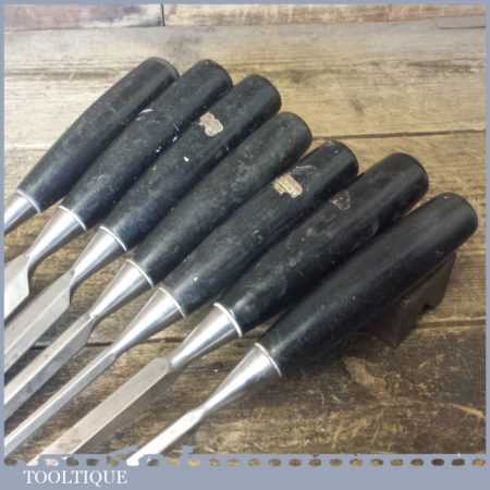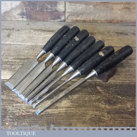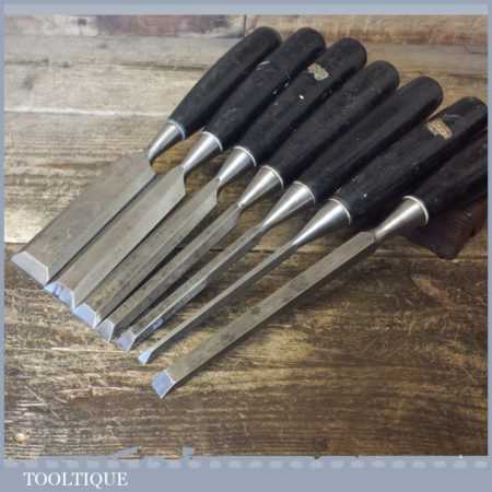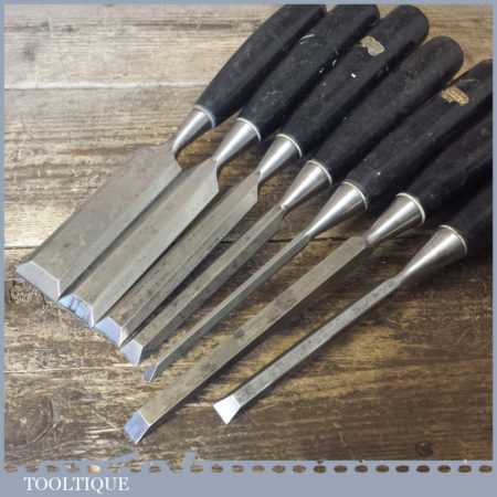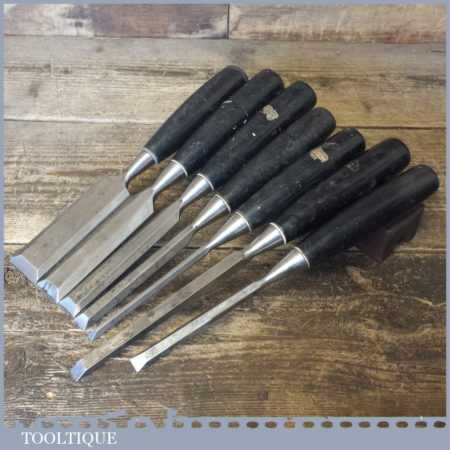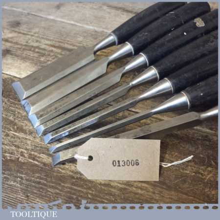 6 No: Stanley No: 5001 carpenter’s bevel edge chisels (1/4”, 3/8”, 1/ 2”, 11/16”, 1” & 1 ¼”) with plastic handles plus 1 No: 3/8” mortice chisel, these are fully refurbished, sharpened and honed ready for use and in good used condition.