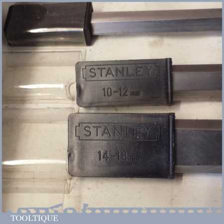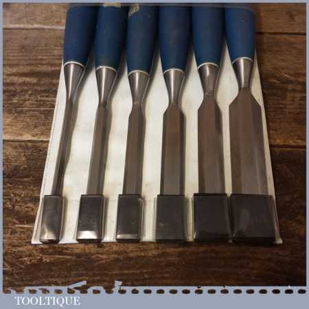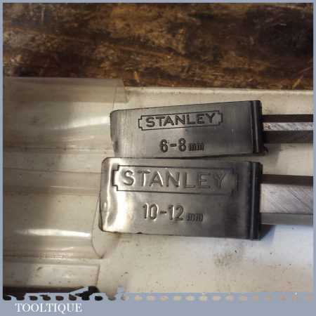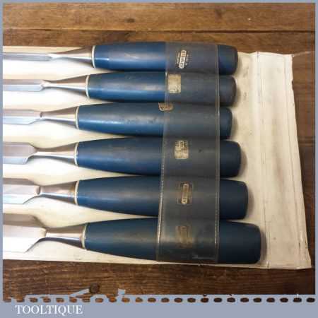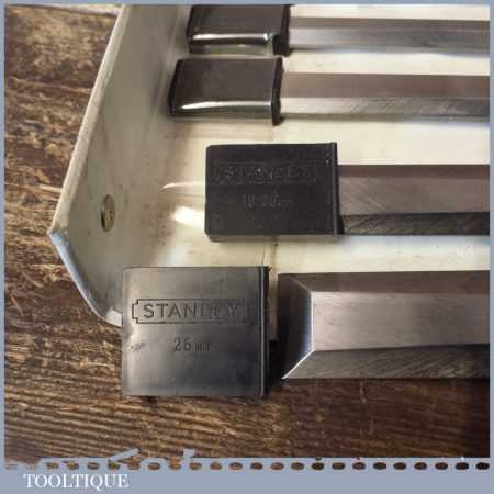 6 No: vintage Stanley carpenter’s No: 5002 socketed bevel edge chisels with plastic handles in good used condition, fully refurbished sharpened and honed ready for use.
