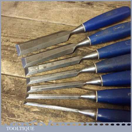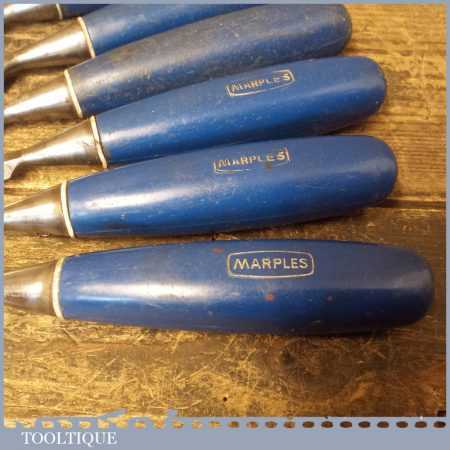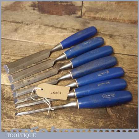 7 No: vintage Marples Blue Chip socketed bevel edge chisels (from ¼” to 1 ¼”) in good used condition, fully refurbished sharpened and honed ready for use.