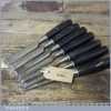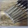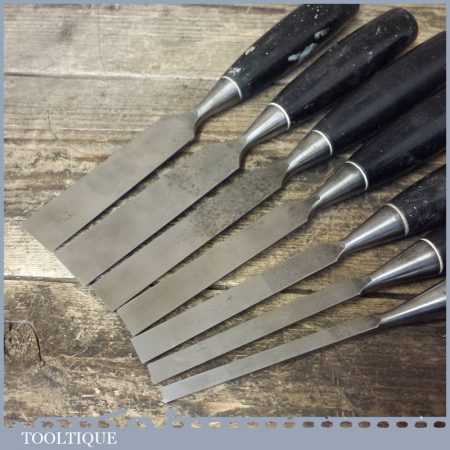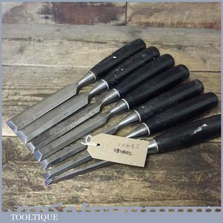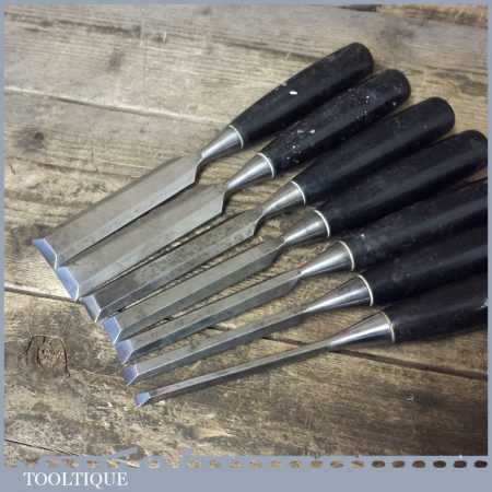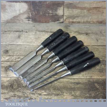 7 No. vintage Stanley No: 5001 bevel edge chisels (from ¼” to 1”) in good used condition, fully refurbished sharpened and honed ready for use.