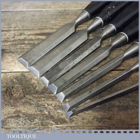 These chisels has been checked to ensure the tang is seated properly and the handle is solid and fit for use. All refurbished chisels are water cooled during the sharpening process to ensure the tempering is not affected. These old cast steel chisels are hand forged and far superior in quality because of the high carbon steel that was used which produces a keener edge, this was also generally used throughout the full length.