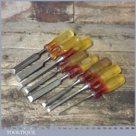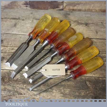 8 No: Vintage Marples Shamrock carpenter’s bevel edge and firmer chisels (from 1/8” to 1”) with shatterproof handles, in good used condition fully refurbished sharpened and honed ready for use. Note: These are the old type, Not Irwin.