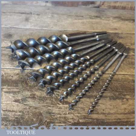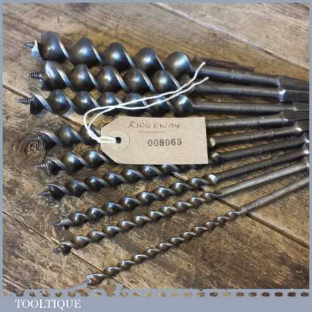 9 No: vintage Ridgeway carpenters ¼” to 1” auger bits for a brace in good used condition.