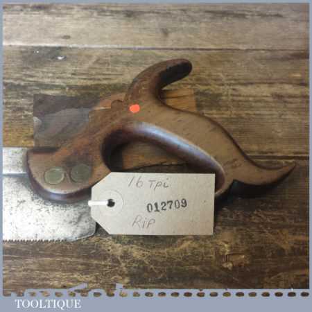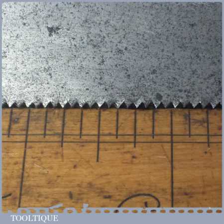 The saw has been thoroughly cleaned, jointed, resharpened and set by hand so that all the hard work of getting an old vintage saw right has been undertaken. We do this so that the next sharpening is easier and no more than a quick freshen up would be required. Those who are familiar with sharpening will know this is no small job and requires skill, effort and time to achieve good results.