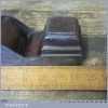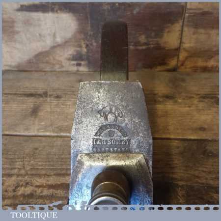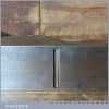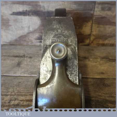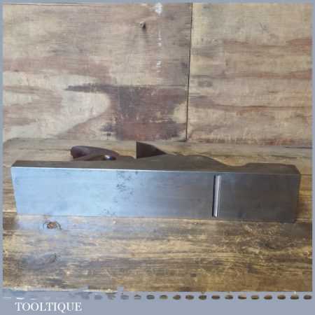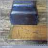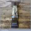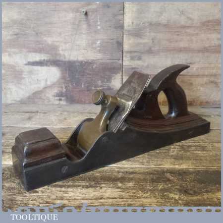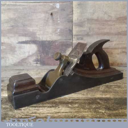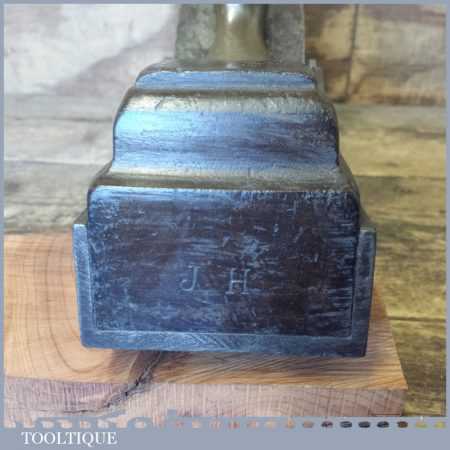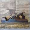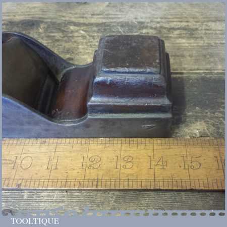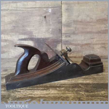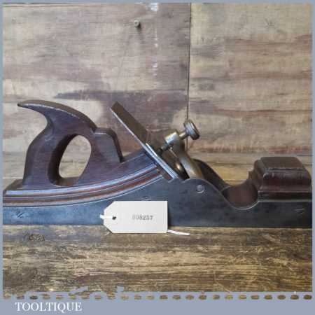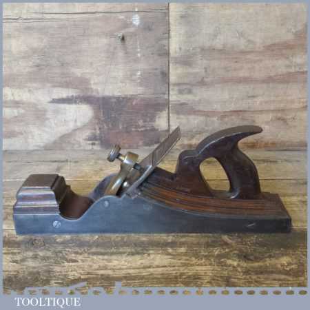 Antique 14½” Scottish pattern panel plane with a nicely detailed mahogany infill and what is probably a replacement I. Sorby iron in good used condition. The plane has a flat and true cast iron body but if you look closely it has a removable tapered wedge screwed into the infill, behind the iron, this is probably due to the original thicker parallel iron being worn out. However, on the plus side it works a treat and will always take a tapered iron which are much easier to find if intended for use.