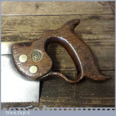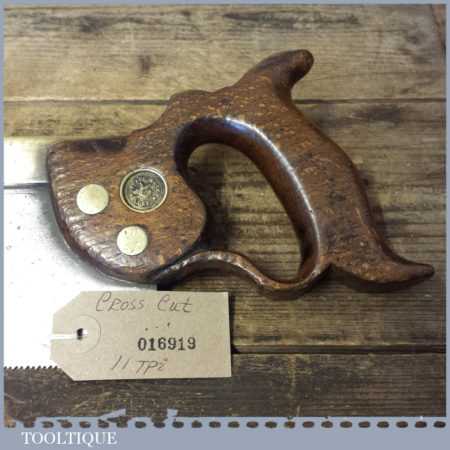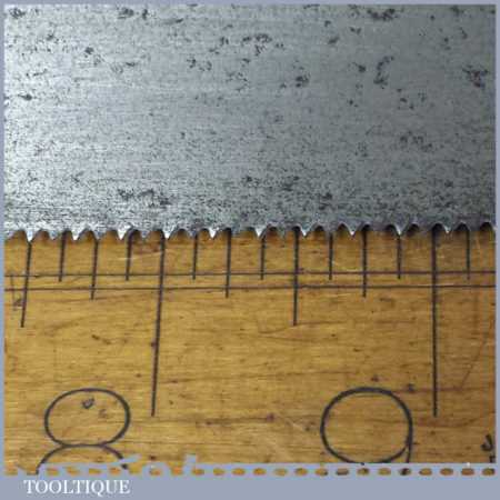 The saw has been thoroughly cleaned including under the handle, jointed, resharpened and set by hand so that all the hard work of getting an old vintage saw right has been undertaken. We do this so that the next sharpening is easier and no more than a quick freshen up would be required. Those who are familiar with sharpening will know this is no small job and requires skill, effort and time to achieve good results.