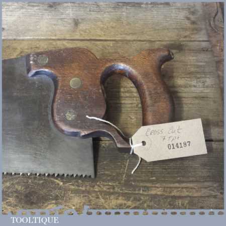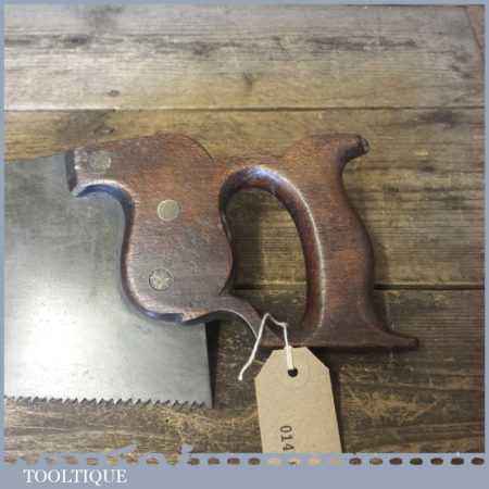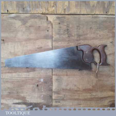 The saw has been thoroughly cleaned including under the handle, jointed, resharpened and set by hand so that all the hard work of getting an old vintage saw right has been undertaken. We do this so that the next sharpening is easier and no more than a quick freshen up would be required. Those who are familiar with sharpening will know this is no small job and requires skill, effort and time to achieve good results.