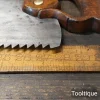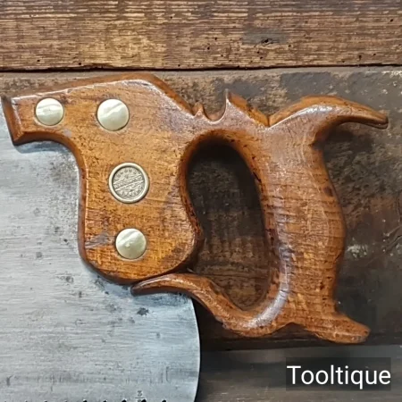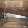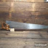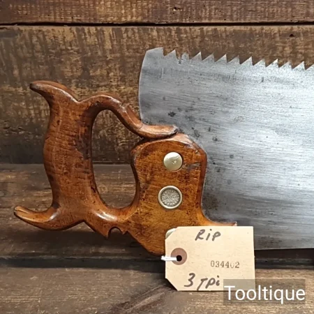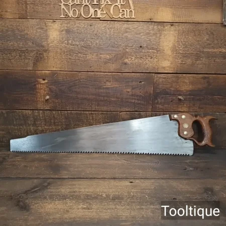 Antique 28” Drabble & Sanderson Warranted ‘London Spring’ Steel 3 Tpi Rip Saw, refurbished ready for use and in good used condition. Note: Hand Sharpened, Relaxed Rake at the toe gaining in aggression towards the handle for easier start and less likely to snatch. The saw has been thoroughly cleaned, jointed, resharpened and set by hand so that all the hard work of getting an old vintage saw right has been undertaken. We do this so that the next sharpening is easier and no more than a quick freshen up would be required. Those who are familiar with sharpening will know this is no small job and requires skill, effort and time to achieve good results.