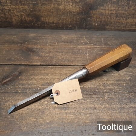 Antique 3/8” Timber Framing Socket Mortice Chisel with a Fruitwood Handle, refurbished ready for use and in good used condition. Note: Solid fitting handle. All refurbished chisels are water cooled during the sharpening & flattening process to ensure the tempering is not affected.