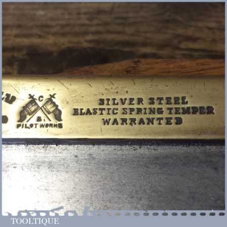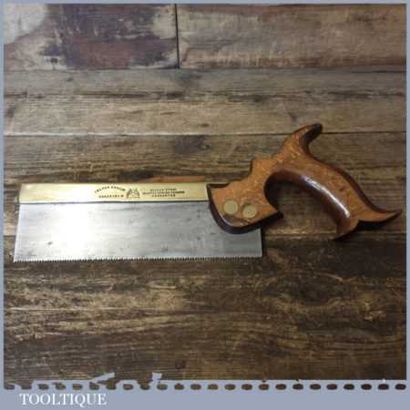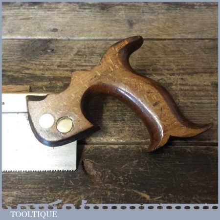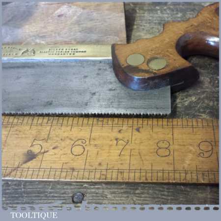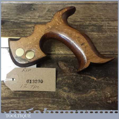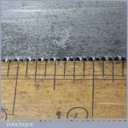 The saw has been thoroughly cleaned including under the handle, jointed, resharpened and set by hand so that all the hard work of getting an old vintage saw right has been undertaken. We do this so that the next sharpening is easier and no more than a quick freshen up would be required.