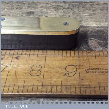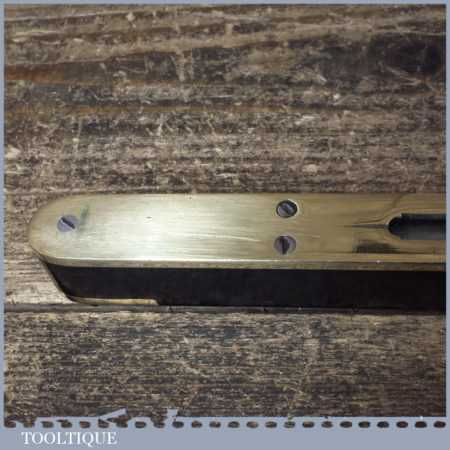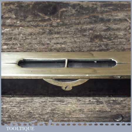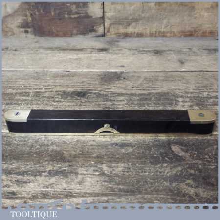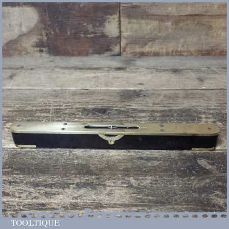 Antique 9” ebony and heavy brass spirit level with original clear bubble tube in good used condition. Note: the level hasn’t been tested and may require resetting in putty if intended for use.