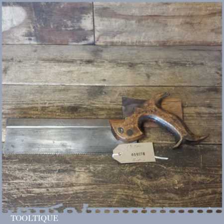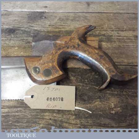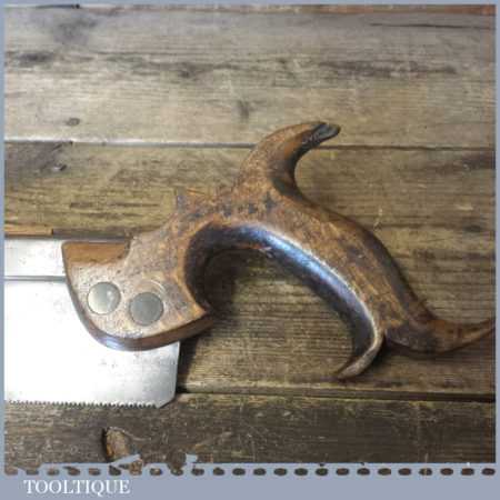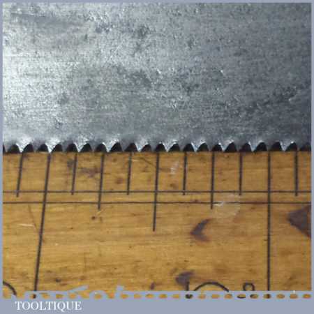 The saw has been thoroughly cleaned including under the handle, jointed, resharpened and set by hand so that all the hard work of getting an old vintage saw right has been undertaken. We do this so that the next sharpening is easier and no more than a quick freshen up would be required. Those who are familiar with sharpening will know this is no small job and requires skill, effort and time to achieve good results.