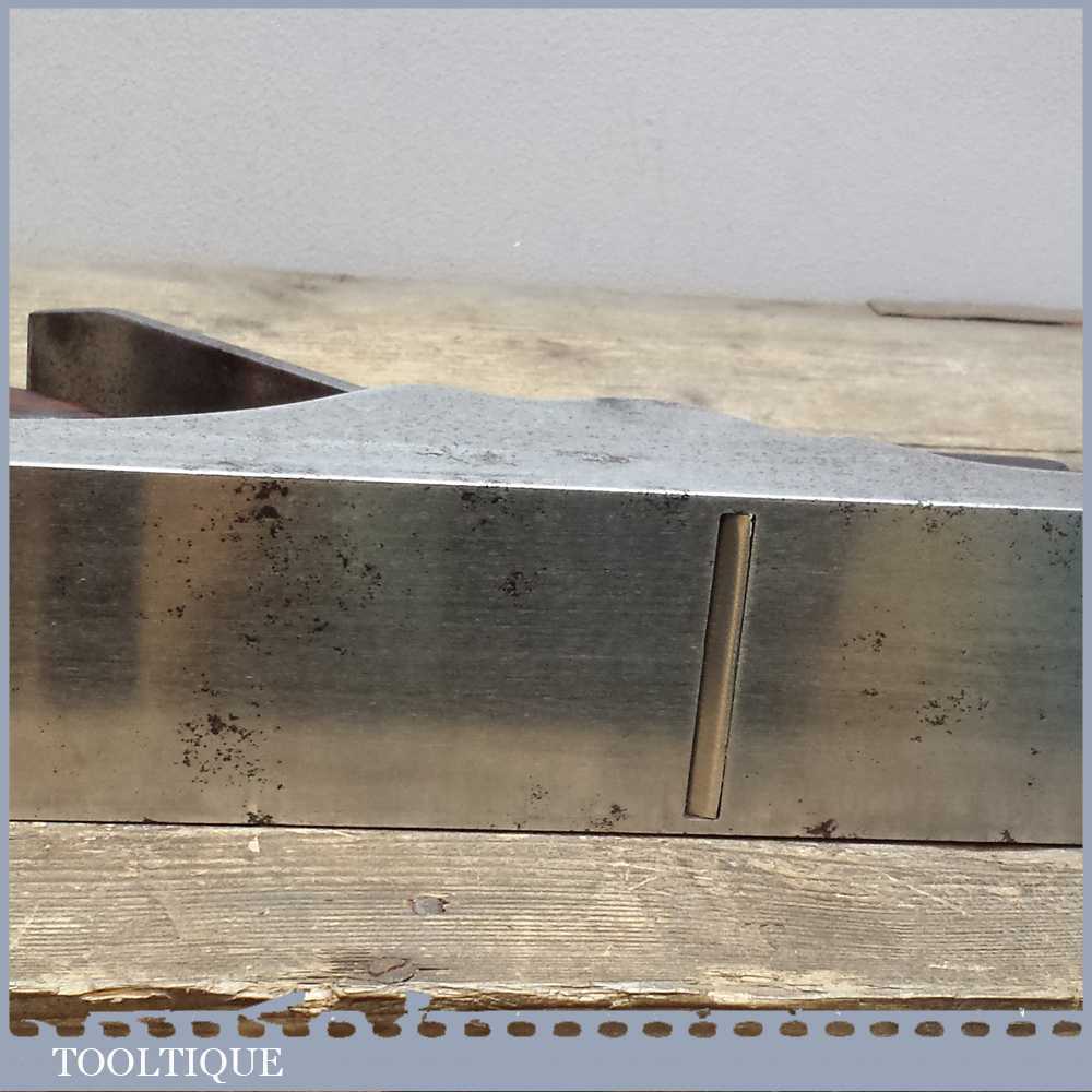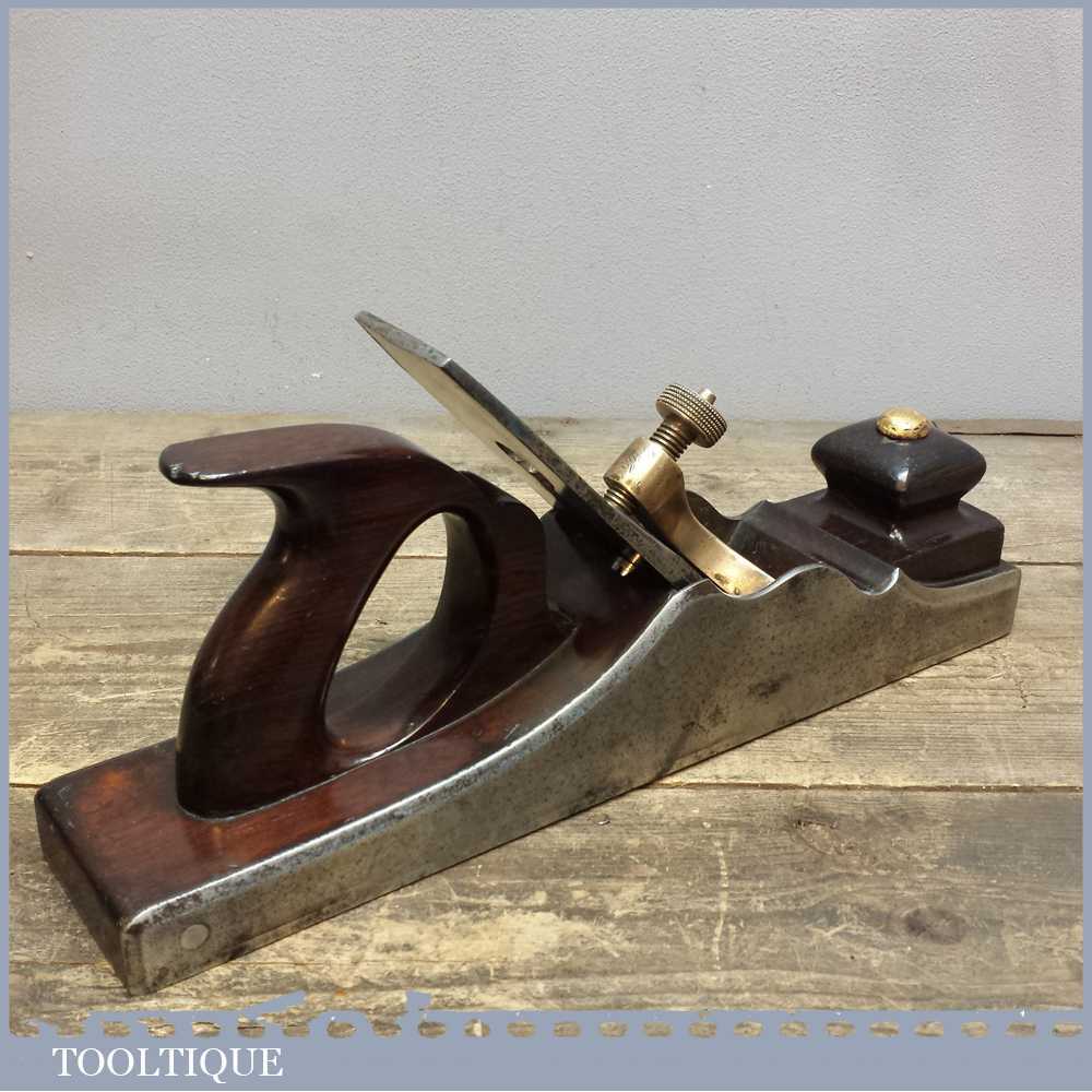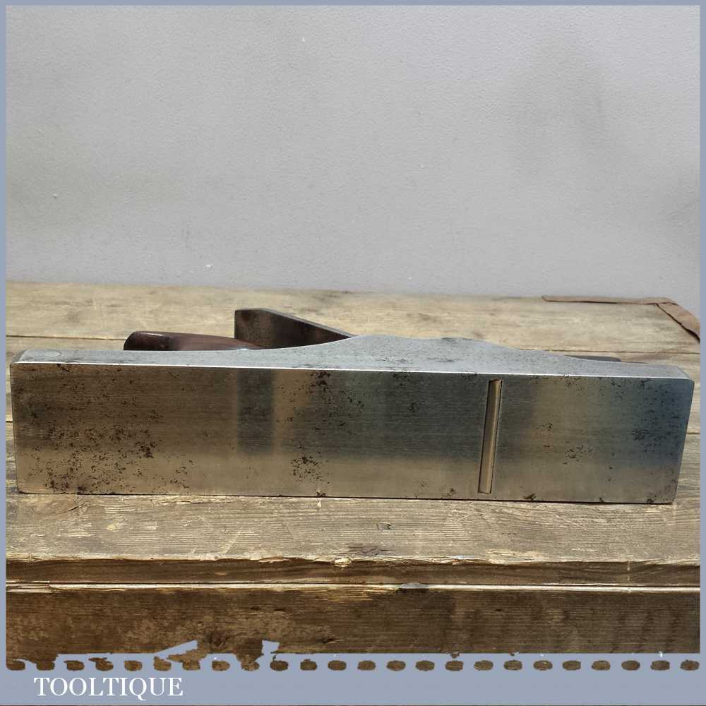 Antique Alex Mathieson 13 1/2” dovetailed panel plane with Robert Sorby parallel iron and very good rosewood infill. There is some pitting to the main body which we have tried to highlight in the pictures but these planes do tend to have this and it’s quite common. It’s still a very nice plane clearly stamped with the makers name on the front bun. It’s perfectly flat and works well for those looking for one to use.